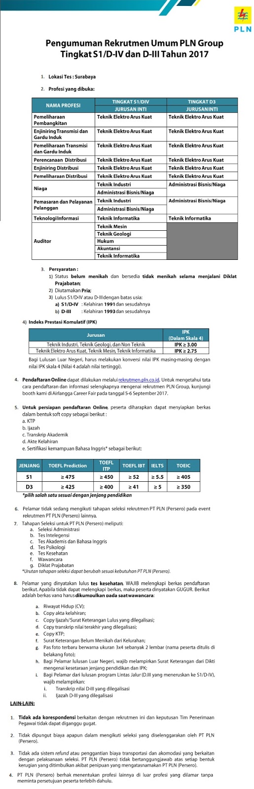 - Tidak dipungut biaya apapun dalam mengikuti seleksi yang diselenggarakan oleh PT PLN persero